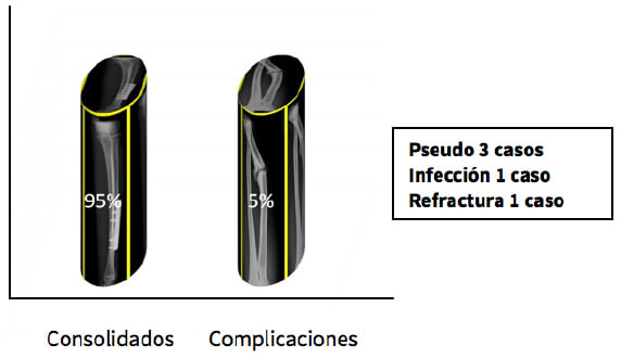 Forearm fractures in children are very common and account for 45% of all pediatric fractures with a male predominance of 3-1 and an increased incidence in over 5 years, the management of these fractures aim, getting healing : 1 -. Anatomic reduction of the fragments with restoring bone length and rotation, permitting full supination prone; 2 -. Stable fixation that allows early mobilization of the adjacent joints. 3 -. The return of the radial curvature influences not only functional outcome of mobility but also on the strength of apprehension. In this paper a prospective clinical review at the University Hospital of the Andes in Mérida was conducted over a period of 4 years from 2006 to 2010, studying 2,869 cases of forearm fractures in children 2-16 years of which 815 cases corresponded to diaphyseal fractures. The treatment was applied as follows: Conservative 64% (520 cases) with brachial palmar plaster for 6 weeks. Surgical: 36% (295 cases), 210 cases Pegged representing 71.2%, Blocks: 72 cases representing 24.4%, External fixator: 13 cases representing 4.4%.