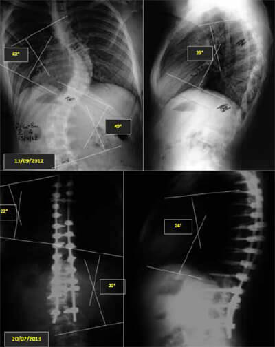 En este trabajo se confirma la capacidad del sistema de tornillos pediculares de cumplir el objetivo tradicional de la cirugía de la escoliosis: la máxima corrección en el plano coronal y prevención de progresión de la deformidad (Tabla N°3), mientras que el mantiene el balance sagital. Series Anteriores han demostrado una mejor corrección de la curva después de la fijación con tornillos pediculares que después de la fijación con sistema híbrido6.