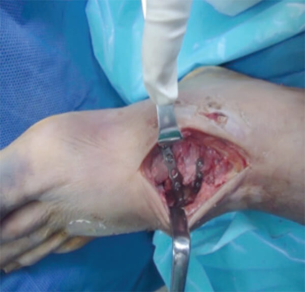 Iniciamos la cirugía con el paciente colocado en decúbito prono; colocación de torniquete en muslo; doble abordaje dorsal del pie, y se realiza la reducción de la fractura de escafoides. Como no se disponía de tornillos de longitud adecuada, fue necesaria la colocación de un tornillo para minifragmentos que diera compresión y la posterior colocación de una placa para minifragmentos, moldeada, obteniendo una reducción satisfactoria. Al visualizar el defecto óseo que existía en el espacio de la 2da cuña, se tomó injerto dimensionado de la cresta iliaca ipsilateral, considerando las medidas del defecto y sustituyendo así la cuña (Fig.4 y 5) con posterior colocación de la placa para minifragmentos, moldeada, a manera de puente. Por último, se realiza la fijación de la lesión de Lisfranc con tonillos de 3.5 mm., desde la posición lateral de la cuña medial hasta la base del 2 metatarsiano, logrando así, estabilizar dicha lesión (Fig.5 y 6).