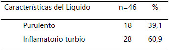 De las 46 articulaciones a las cuales se les practicó artrocentesis bajo medidas antisépticas, 39,1% (18) mostraron líquido sinovial con pus franco aspirado, mientras que en 60,9 % (28) se evidenció líquido sinovial inflamatorio y turbio (Tabla 3).