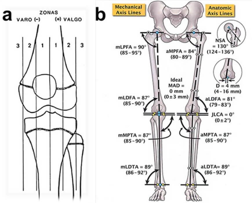 La alineación normal de la extremidad inferior en el plano coronal está definida por el eje mecánico. El balance es logrado cuando el eje mecánico pasa por el centro de la rodilla; cuando no pasa por el mismo se define como desviación del eje mecánico (MAD) Mechanical Axis Deviation, si pasa lateral al centro de la rodilla tendremos deformidades en valgo y si pasa medial, deformidades en varo; se considera normal el MAD = 0±3 (4).