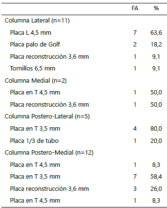 En la tabla 2, se muestra la relación entre el material de osteosíntesis utilizado para la fijación de las fracturas de acuerdo a la columna fijada con el mismo según la Clasificación de Schatzker-Kfuri.